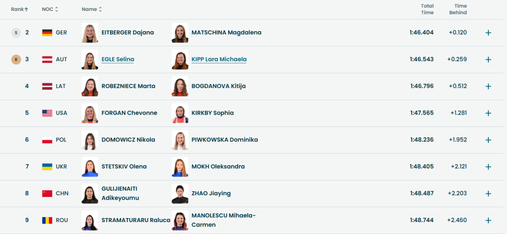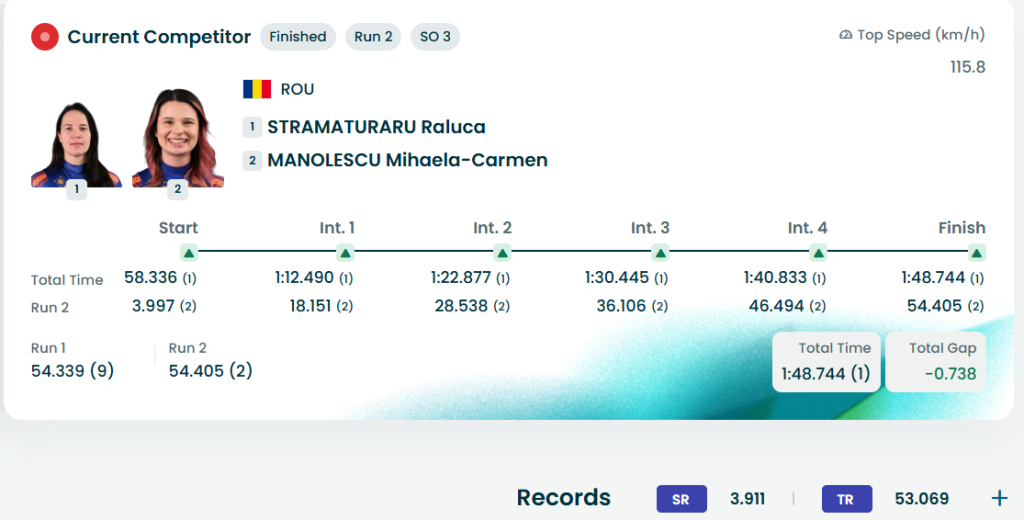 Cel mai bun loc pentru România este obținut de tandemul Strămăturaru-Manolescu la întrecerea de dublu sanie. Raluca portdrapel și cu o experiență acumulată în cinci ediții consecutive de Jocuri Olimpice a fost în echipă cu Mihaela Carmen Manolescu debutantă în turneul olimpic. Reprezentantele României au depășit sportivele din Canada și Slovacia. Ele s-au clasat pe nouă. Italiencele sunt campioane olimpice. S-au impus Andrea și Marion în fața sportivelor din Germania.