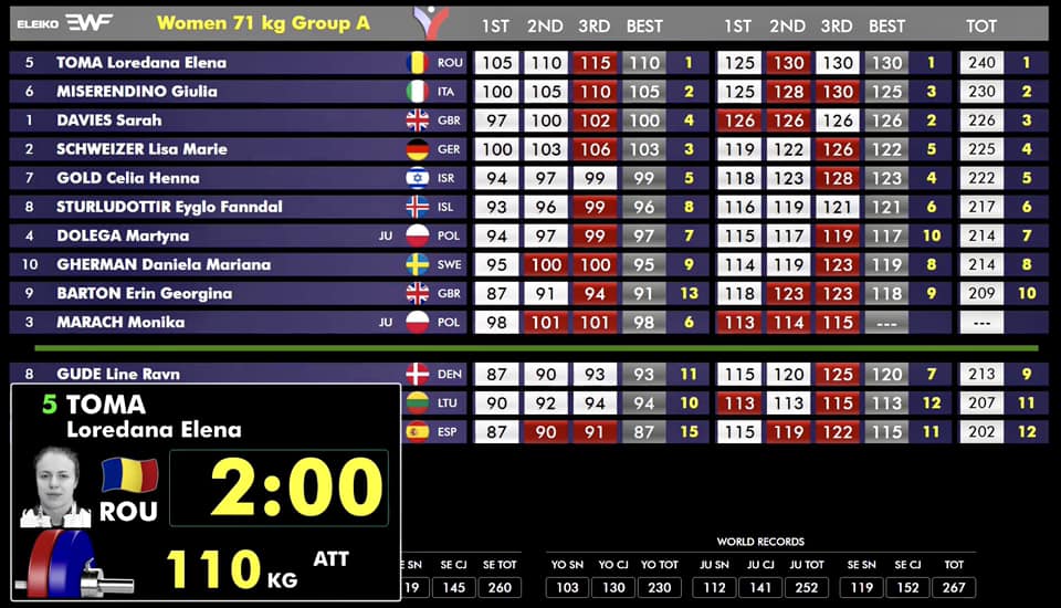 Loredana Toma a câştigat trei medalii de aur și ajunge la un total de şapte titluri continentale în carieră la Campionatele Europene de Haltere.