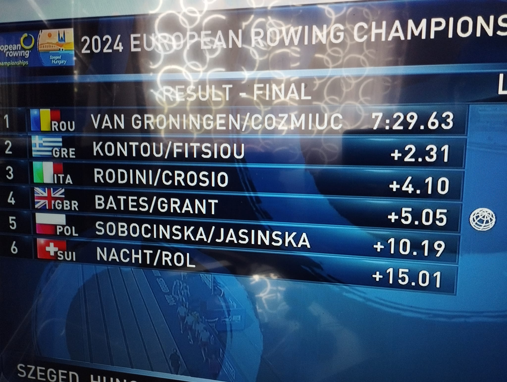 Medalii pentru România la Europenele de la Szeged. Aur pentru Gianina van Groningen și Ionela Cozmiuc. Argint pentru Mădălina Bereș, Maria Lehaci, Magdalena Rusu și Amalia Bereș. Bronz pentru echipajul de 8+1 masculin, compus din Mihăiță Țigănescu, Ciprian Tudosă, Florin Arteni, Mugurel Semciuc, Constantin Adam, Sergiu Bejan, Ștefan Berariu, Florin Lehaci și Adrian Munteanu.