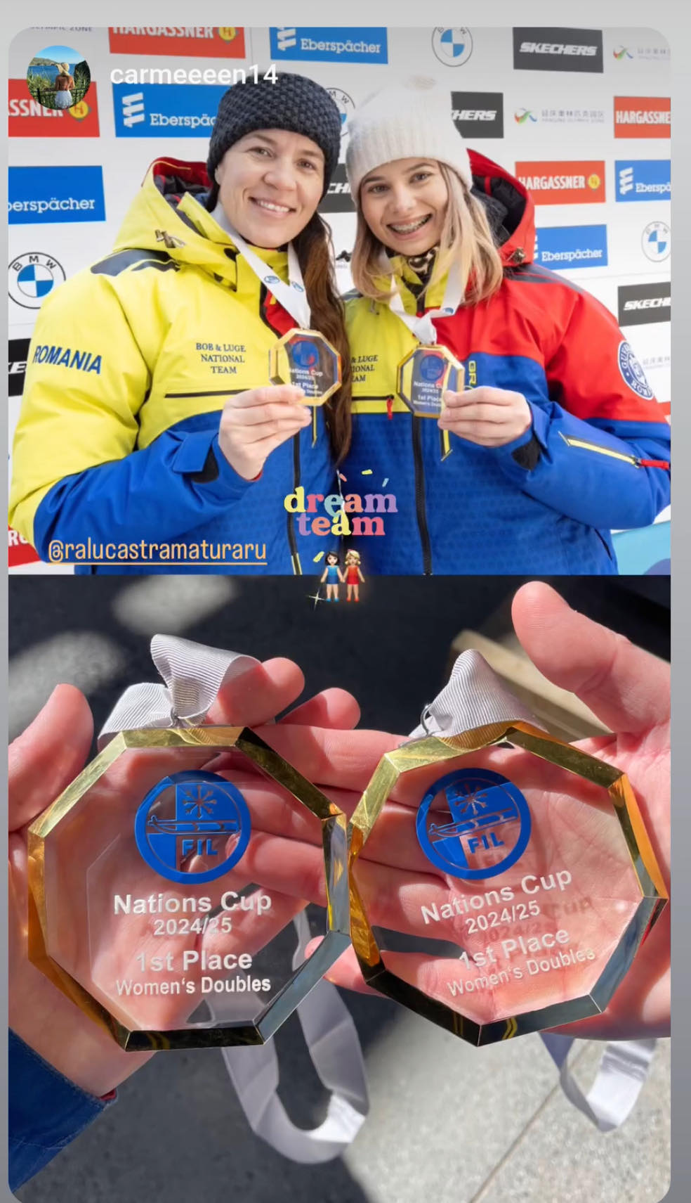 ”Este concursul de Cupa Națiunilor. S-a premiat Totalul Cupei Natiunilor! Împreună cu Carmen am câștigat etapa de Cupa Națiunilor de la Winterberg, iar la final asta ne-a adus împreună cu Germania și Italia la egalitate pe locul 1.”